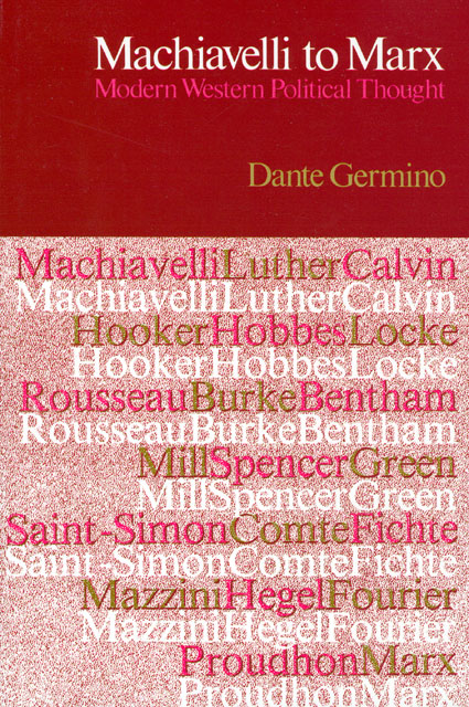 According to conventional periodization, a profound break in the continuity of Western political theory occurred around 1500 and marked the beginning of "modern" political thought. In Machiavelli to Marx Dante Germino examines the scholars of this period whose works he feels have made significant new approaches to the critical understanding of our world and, consequently, to the problems of our time. Beginning with Machiavelli, the author covers major political philosophers such as Hobbes, Locke, Rousseau, and Burke and gives lucid, perceptive accounts of what they thought and taught about politics. He discusses utilitarianism, liberalism, scientism, and messianic nationalism through the writings of such influential thinkers as Bentham, Spencer, Saint-Simon, and Fichte and concludes with three of the foremost political philosophers of the nineteenth century—Fourier, Proudhon, and Marx.