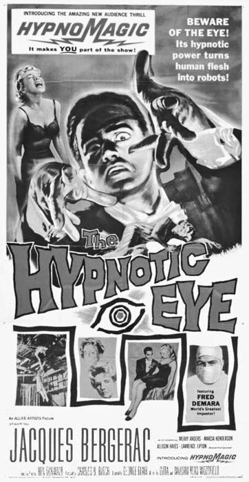 I don’t think I thought about hypnosis very much until a couple of years later when, in 1960, I happened see a horror film, The Hypnotic Eye, the movie, according to publicity posters, “that introduces HypnoMagic, the thrill you SEE and FEEL! It’s the amazing new audience sensation that makes YOU part of the show!” There were warnings that HypnoMagic could cause viewers of the film to actually become hypnotized: “Watch at your own risk!”